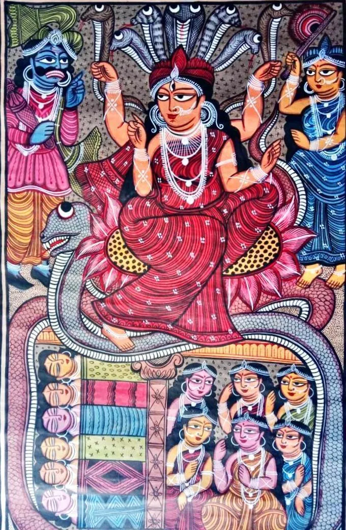 Item Description : Presenting "Goddess Mansa," a captivating Patachitra or Pattachitra artwork that beautifully depicts the serene and powerful Goddess of snakes. This traditional piece is created on 'Pat' or 'Pata,' where art paper is skillfully pasted onto cloth using a unique blend of chalk and tamarind seed gum. The artwork is painted with natural colors and dyes, ensuring a vivid and eco-friendly creation with no chemical or artificial colors involved. The intricate details and vibrant hues showcase the rich cultural heritage of Patachitra or Pattachitra art, bringing the divine presence of Goddess Mansa to life. Please note, the frame is not included. For framing options, click on the customize button to select and enhance this exquisite piece according to your preference.